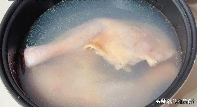 2. 锅中加净水,放入鸡腿、姜片、半勺料酒,大火煮开焯水,撇去名义的浮沫,煮2分钟后捞出鸡腿,用温水冲洗干净,沥干水分备用。
