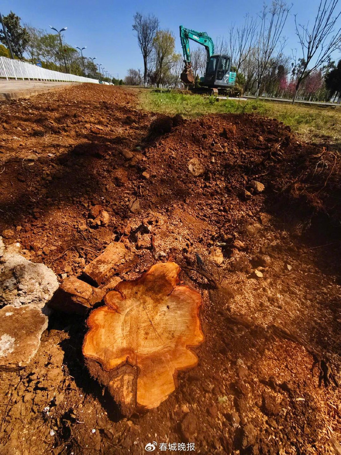 3月19日下昼3时许,记者来到海东路与环湖东路交叉口的海东湿地。现场一台绿色挖掘机正在平整绿化带,数厘米高的树桩残留其间,簇新木屑洒落一地,看上去砍伐功课刚完成不久。经现场阔别,被砍伐树种确为桉树,而相近水杉、草本植物等未受影响。
