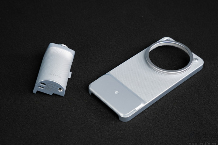 此时,vivo提供了三种选拔。包括“撞色”筹办的深灰色护圈、67mm口径的滤镜转接环,以及最重头的部分、增距镜的装配底座。