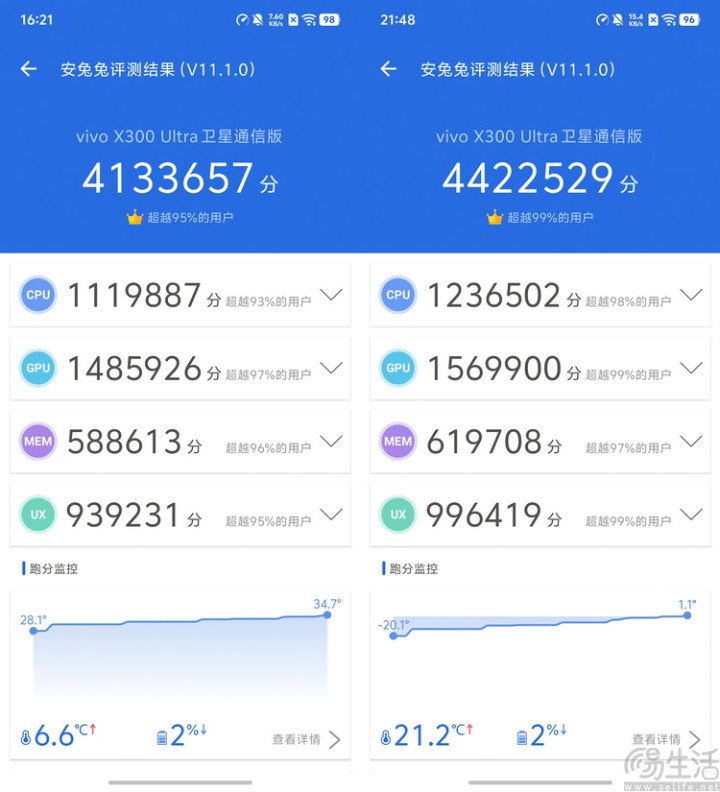 咱们手头16GB+1TB的vivo X300 Ultra在安兔兔评测中,常温跑出了413万3657分的详尽收货,低温环境更是高达442万2529分。