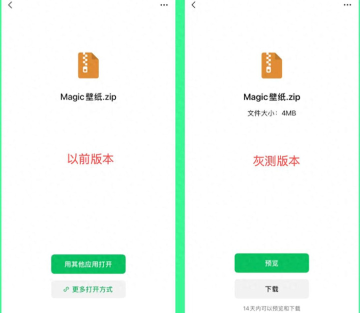 除了「红包」或「转账」的按钮以外,最近微信还加入了新功能,便是目下咱们收到文献后,之前需要第三方欺诈怒放,但目下不错径直预览或下载,另外内部的文献还因循共享、下载、储藏。
